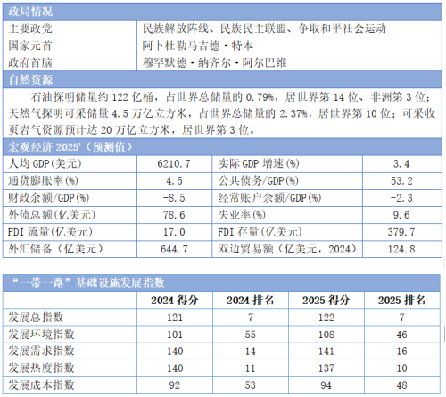 政治环境方面,阿尔及利亚政局总体稳定,但青年失业率较高,对社会稳定构成一定挑战。经济环境方面,得益于农业、农业食品工业、纺织工业等行业的高速增长,2024年实际GDP增长率达到3.8%。营商环境方面,自2025年以来,政府着力推动税务系统全面数字化建设,旨在简化税务流程并增强税收透明度,以提振投资者信心。