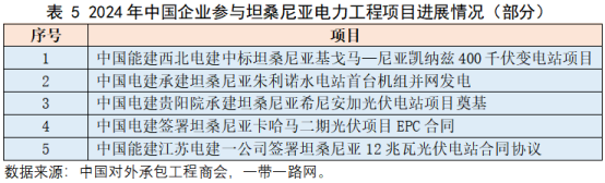 中国企业在坦桑尼亚深耕电网升级和可再生能源等领域。中国企业凭借在资金、技术、设备供应和工程实施方面的综合优势,成为推动电力工程基础设施建设的重要力量。2024年中国企业新签电力工程基础设施项目多达15个,基本为可再生能源及电网升级项目。在可再生能源领域,中国企业持续在光伏、水电等领域发力。其中,由中国电建承建的坦桑尼亚朱利诺水电站,是非洲在建总装机容量最大的水电站。电网升级方面,东北电网二期、坦桑尼亚-赞比亚输电互连(TAZA)输电线等项目有效地促进了当地区域电网互联互通。